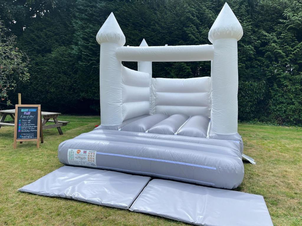 Our brand new custom-made white bouncy castle is now available to hire in the Nottinghamshire Area! She has been built here in the UK to top safety standards and is the perfect addition to our soft play hire family, adding more play space and keeping older children happy too! At 15 x 11ft, there will be plenty of space to bounce but she’s also designed to fit most indoor venues with a height of 11ft! (11.5ft – 12ft required)